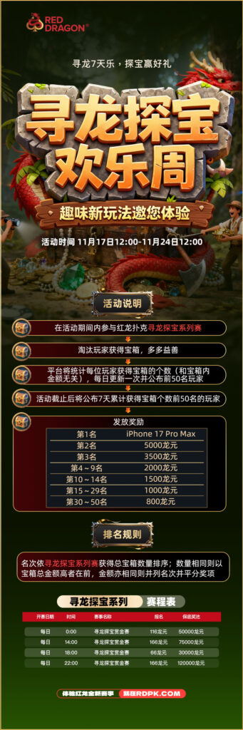 在活动期间,参与《红龙扑克 – 寻龙探宝系列赛》,