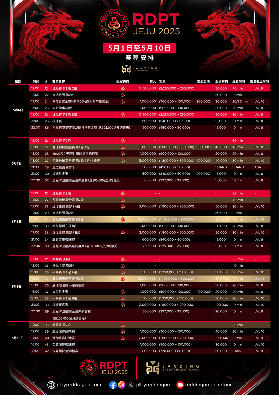 2025年5月1日至5月10日,红龙杯将在济州神话度假村再次点燃战火——主赛事250万韩元买入,主赛保底20亿韩元,创下系列赛新高。